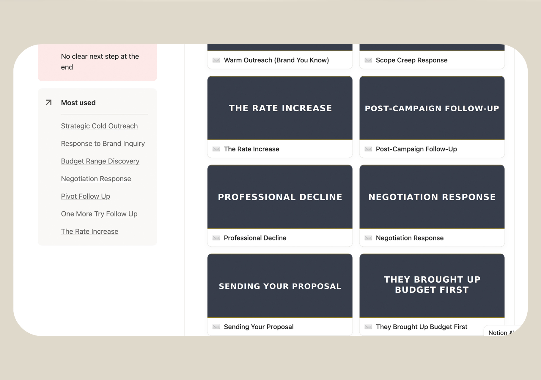 You get 25 email templates that cover the full lifecycle of a brand partnership. Cold outreach that actually gets opened. Follow-ups that don't feel desperate. Negotiation emails that get you paid what you're worth. Renewal pitches that turn one-off campaigns into recurring income.