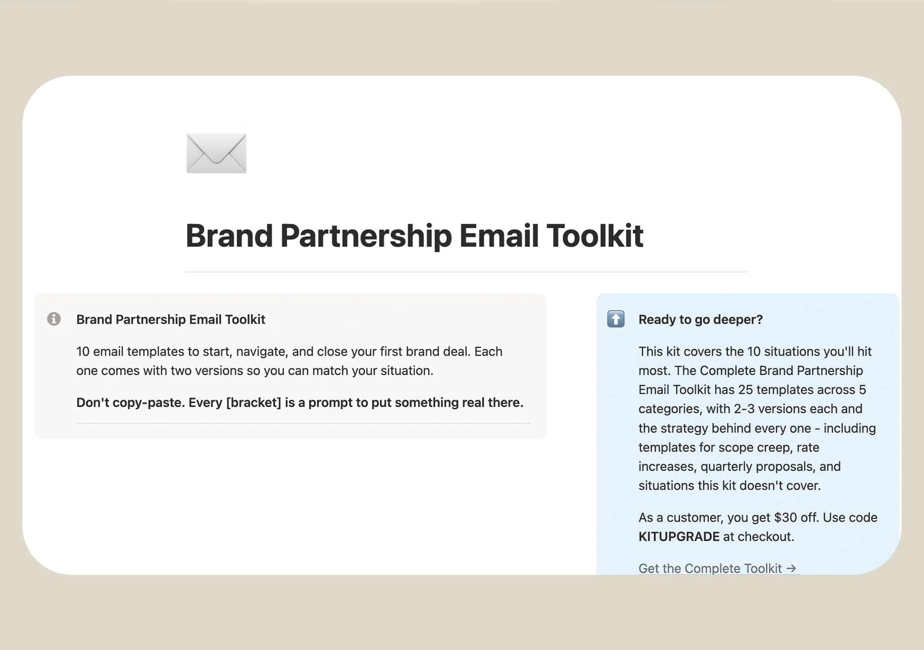 The First Brand Deal Kit gives you 7 email templates that handle the hard part for you. Each one comes with the psychology behind why it works, subject line formulas that actually get opened, a timing guide so you know exactly when to follow up, and a mistakes-to-avoid breakdown so you don't accidentally tank the deal before it starts.