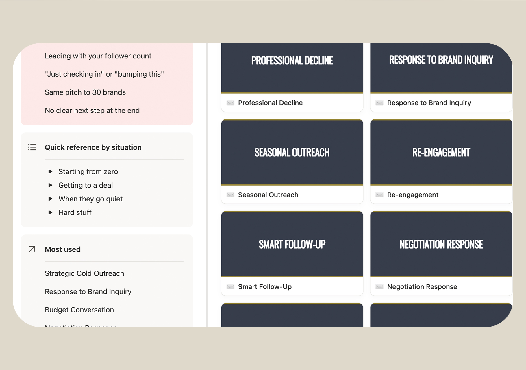 Perfect, this is designed for beginners. It includes a complete setup process, explains how to find the right contacts at brands, and walks you through the entire process from research to follow-up.
